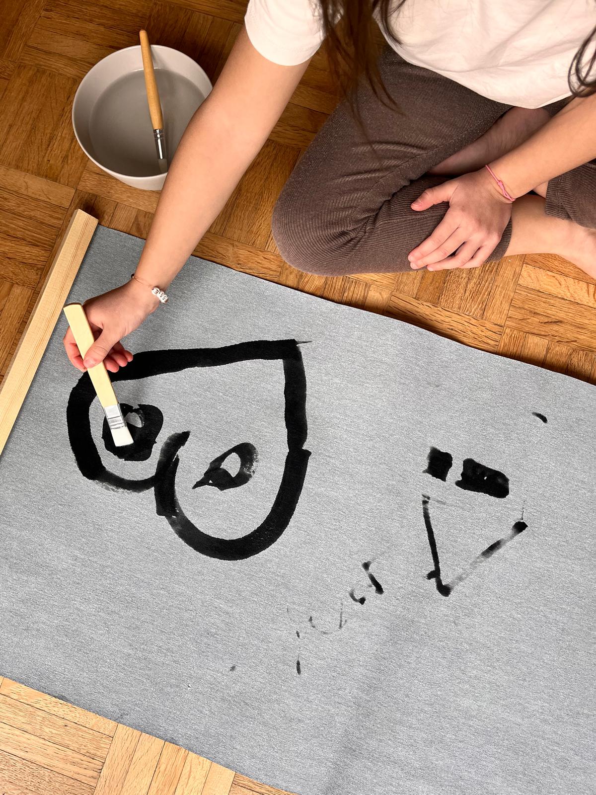 Les dessins apparaissent au contact de l’eau, puis disparaissent naturellement en séchant, laissant la toile vierge pour recommencer encore et encore.